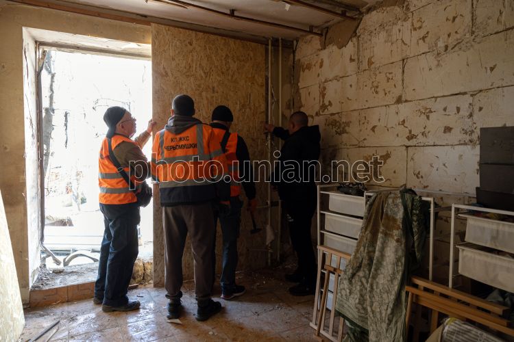 Працівники комунальної служби закривають вибиті вікна фанерою у пошкодженому від ворожої атаки житловому будинку в Одесі, 5 квітня 2026 р. Внаслідок нічної дронової атаки пошкоджено житлові будинки в Хаджибейському районі міста. Постраждали троє людей. Фото Гіманов Олександр / УНІАН