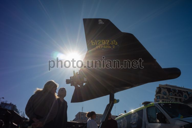 Дрон "Герань-2" на виставці знищеної російської військової техніки на Михайлівській площі у Києві, 5 квітня 2026 р. Фото УНІАН