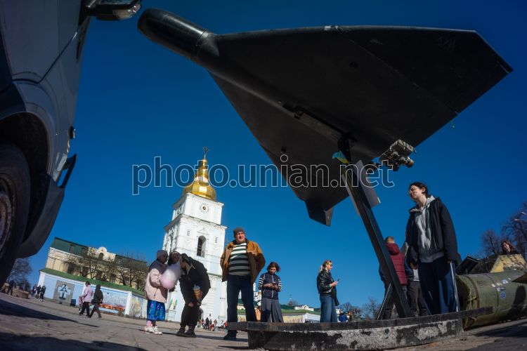 Дрон "Герань-2" на виставці знищеної російської військової техніки на Михайлівській площі у Києві, 5 квітня 2026 р. Фото УНІАН