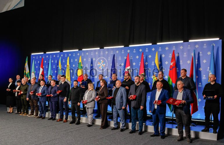 Президент України Володимир Зеленський (у центрі) фотографується на пам'ять з учасниками, нагородженими державними нагородами, під час Конгресу місцевих та регіональних влад при Президентові України, в Ужгороді, 9 квітня 2026 р. Фото Немеш Янош / УНІАН