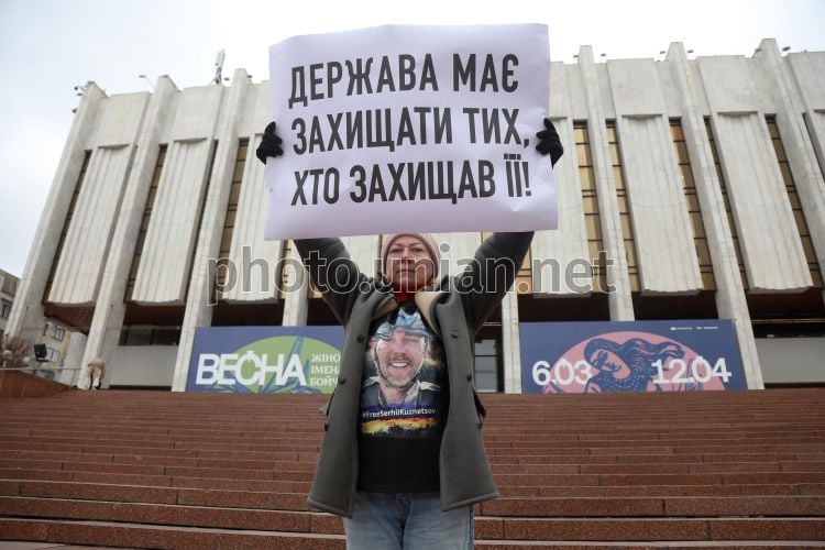 Учасники акції на підтримку Сергія Кузнєцова біля будівлі Українського дому, де проходив круглий стіл на тему: "Nord Stream: газопровід, що приніс війну і досі розколює Європу", в Києві, 9 квітня 2026 р. Фото Ковальчук Віктор / УНІАН