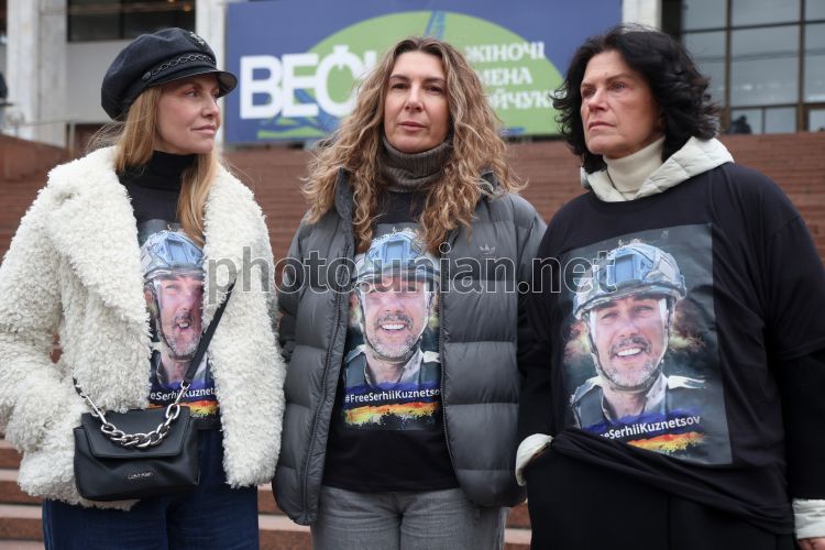 Учасники акції на підтримку Сергія Кузнєцова біля будівлі Українського дому, де проходив круглий стіл на тему: "Nord Stream: газопровід, що приніс війну і досі розколює Європу", в Києві, 9 квітня 2026 р. Фото Ковальчук Віктор / УНІАН