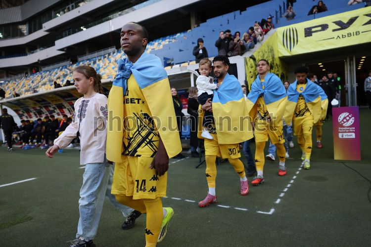 Гравці ФК "Рух" (Львів) під час матчу 23-го туру Чемпіонату України серед команд УПЛ (Прем'єр-ліга) з футболу між ФК «Рух» (Львів) та ФК «Колос» (Ковалівка) на стадіоні «Арена Львів» у Львові, 10 квітня 2026 р. Фото Кравс Євгеній / УНІАН
