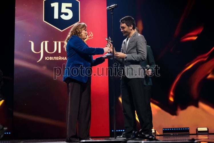 Генеральна продюсерка телеканалів М1 та М2 Натела Чхартішвілі-Зацаринна вручає нагороду Yuna засновнику гурту "The Maneken" Євгену Філатову (гурт THE MANEKEN став переможцем у номінації «Найкращий альбом року») під час 15-ї церемонії нагородження Національної музичної премії YUNA, у Києві, 15 квітня 2026 р. На урочистому ювілейному заході були оголошені переможці у 14 номінаціях. Фото Горлушко Вальдемар / УНІАН