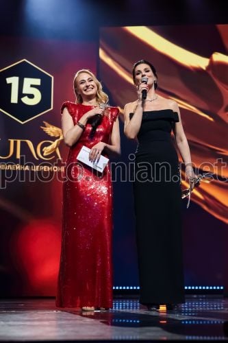 Актриса Анастасія Цимбалару та телеведуча, актриса Марія Єфросиніна під час 15-ї церемонії нагородження Національної музичної премії YUNA, у Києві, 15 квітня 2026 р. Фото Горлушко Вальдемар / УНІАН