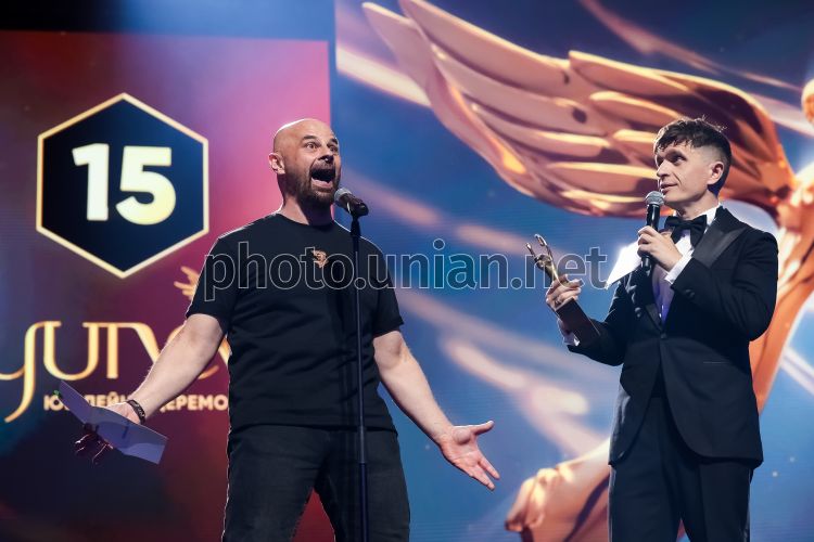 Український актор, музикант, композитор, телеведучий Михайло Кукуюк та ведучий Анатолій Анатоліч під час 15-ї церемонії нагородження Національної музичної премії YUNA, у Києві, 15 квітня 2026 р. Фото Горлушко Вальдемар / УНІАН