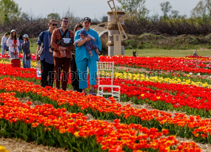 Відвідувачі на тюльпановому полі на території ландшафтного парку в с. Тийглаш (Закарпатська обл.), 19 квітня 2026 р. Фото Немеш Янош / УНІАН