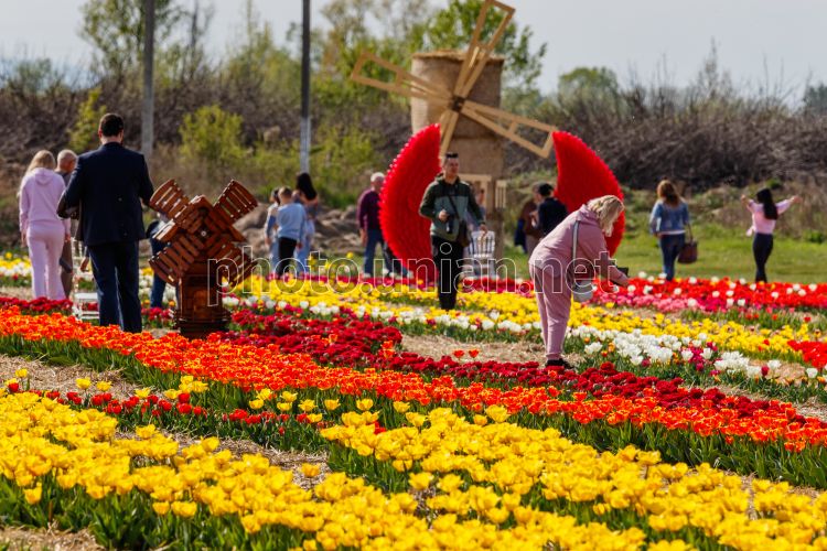 Відвідувачі розглядають тюльпани на території ландшафтного парку в с. Тийглаш (Закарпатська обл.), 19 квітня 2026 р. Фото Немеш Янош / УНІАН