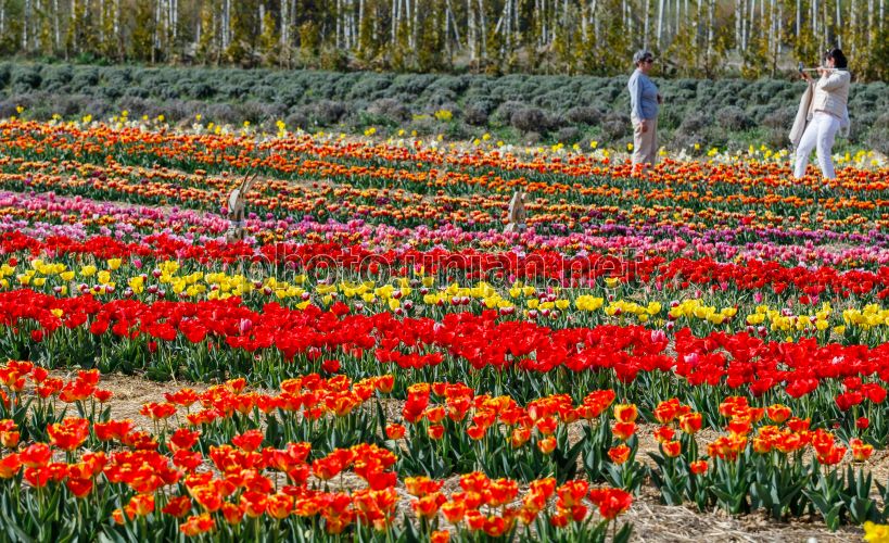 Відвідувачі фотографуються серед тюльпанів на території ландшафтного парку в с. Тийглаш (Закарпатська обл.), 19 квітня 2026 р. Фото Немеш Янош / УНІАН