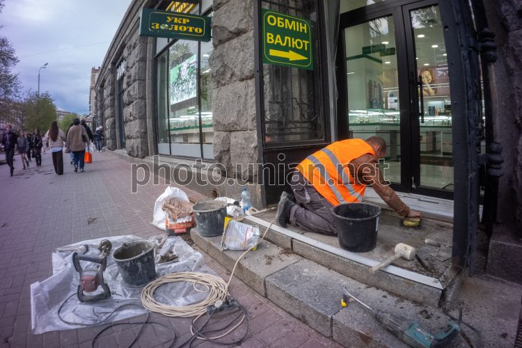 Працівник ремонтує ганок біля одного з магазинів у Києві, 19 квітня 2026 р. Фото УНІАН
