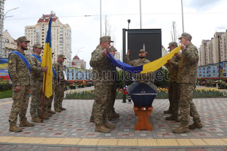 Церемонія прощання з кінорежисером, військовослужбовцем Ігорем Малаховим в Києві, 21 квітня 2026 р. На фронті загинув кінорежисер Ігор Малахов, він з 2023 року вважався зниклим безвісти. Малахов загинув 29 грудня 2023 року в боях під Авдіївкою біля села Степове Донецької області. Ідентифікували полеглого за ДНК. Фото Ковальчук Віктор / УНІАН