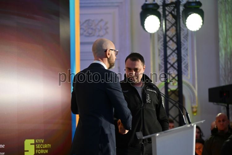 Голова Київського Безпекового Форуму, прем’єр-міністр України у 2014–2016 роках Арсеній Яценюк та керівник Офісу Президента України Кирило Буданов під час 18-го щорічного Київського Безпекового Форуму на тему «Морок чи світанок: чи є світло попереду?», 23 квітня 2026 р. Фото Ратинський В'ячеслав / УНІАН