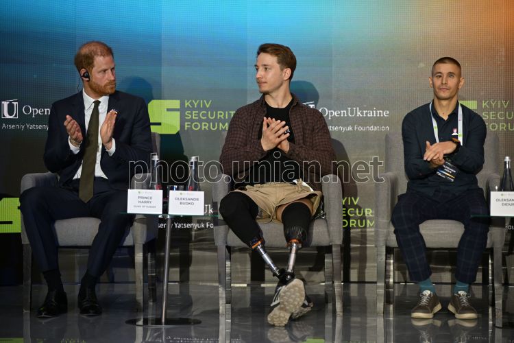 Справа наліво: ветеран, амбасадор ГО «Серце Азовсталі», тренер із посттравматичного зростання Олександр Дідур, ветеран, учасник збірної України на Іграх Нескорених 2023 року Олександр Будько, принц Гаррі, герцог Сассекський, засновник Фундації Ігор Нескорених, т під час 18-го щорічного Київського Безпекового Форуму (Kyiv Security Forum, KSF) на тему «Морок чи світанок: чи є світло попереду?» у Києві, 23 квітня 2026 р. Фото Ратинський В'ячеслав / УНІАН