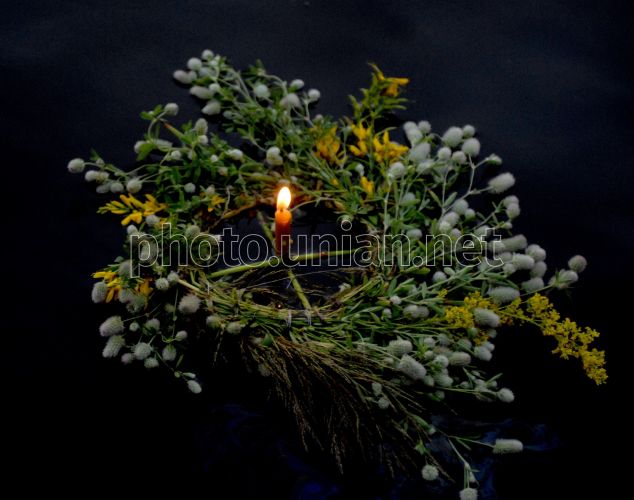 Вінок із польових квітів зі свічкою на воді під час свята Івана Купали в Києві, в неділю, 6 липня 2008 р. Ніч на Купала найкоротша, цієї ночі ніхто не повинен спати. Дівчата плетуть вінки з трав і пускають їх на воду (від того, куди попливе вінок залежить доля дівчини, якщо вінок потоне, значить, суджений розлюбив і заміж за нього не вийти). Всі шукають квітучу папороть, яка за переказами розкривається тільки на декілька митей опівночі на Іванов день і дає можливість тому, що знайшов його управляти світом, вгадувати майбутнє. Ніч на Купала неможлива без очищаючих багать. Навколо них танцюють, через них стрибають - хто стрибне краще і вище, той буде щасливішим. Вважається також, що вогонь укріплює взаємні почуття - тому стрибають і парами. Фото Олега Гордієнка / УНІАН