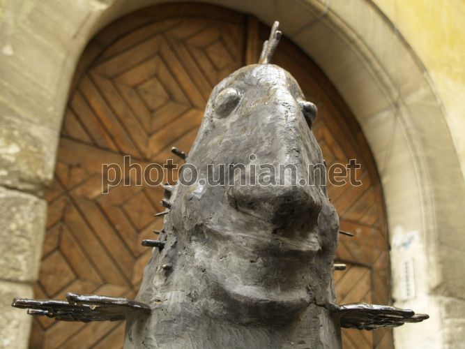 Пам’ятник Усмішці у Львові, в четверг, 10 липня 2008 р. Єдиний у світі пам’ятник Усмішці (риба, яка сміється) скульптор та карикатурист Олег Дергачов подарував Львову з нагоди відкриття у галерії «Дзига» II Міжнародного симпозіуму карикатури у 2000 р. У березні цього року пам’ятник несподівано зник, а днями так само несподівано з’явився на старому місці. Це найменший пам’ятник у Львові. Фото Олександра Барана / УНІАН