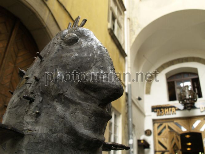 Пам’ятник Усмішці у Львові, в четверг, 10 липня 2008 р. Єдиний у світі пам’ятник Усмішці (риба, яка сміється) скульптор та карикатурист Олег Дергачов подарував Львову з нагоди відкриття у галерії «Дзига» II Міжнародного симпозіуму карикатури у 2000 р. У березні цього року пам’ятник несподівано зник, а днями так само несподівано з’явився на старому місці. Це найменший пам’ятник у Львові. Фото Олександра Барана / УНІАН