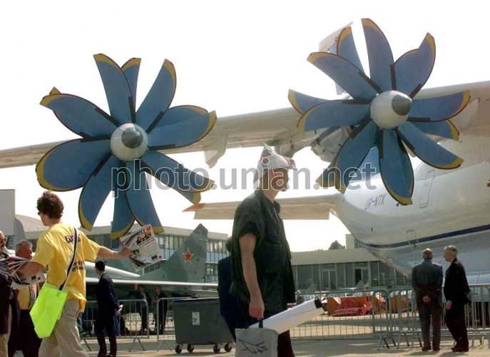 Відвідувач проходить повз український Антонов-70 на летовище Бурже у передмісті Парижу, Франція під час 43-го паризького авіасалону у вівторок, 15 червня 1999р. Україна презентувала на авіасалоні Ан-70 і Ан-124.