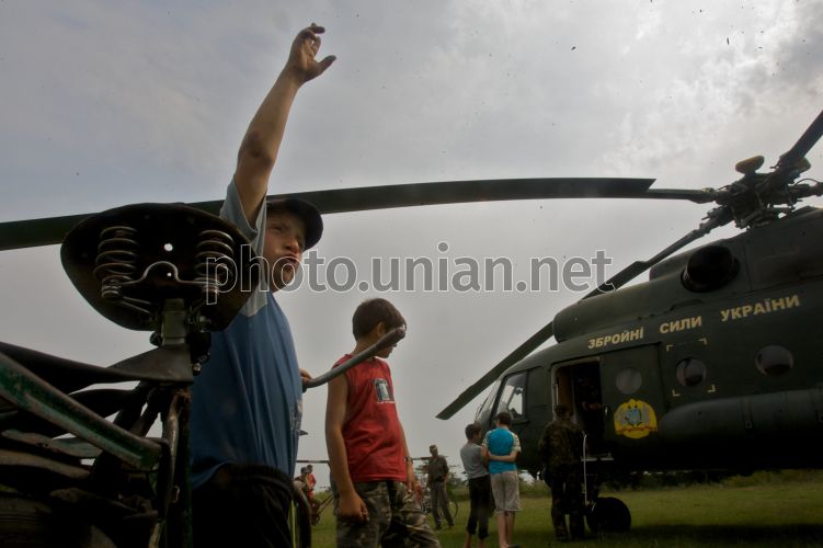 Діти біля вертольота армійської авіації, які надають допомогу місцевим мешканцям в одному з потерпілих від стихійного лиха (повінь) сіл в Чернівецькій обл., в суботу, 9 серпня 2008 р. Цього дня Міністр оборони України приїхав з робочою поїздкою до Чернівецької обл. За словами, міністра в регіонах надзвичайного положення на Західній Україні військовослужбовці Ззбройних сил залишатимуться стільки, скільки це необхідно буде для надання допомоги місцевому населенню та ліквідації наслідків стихії. На даний час, як повідомив міністр, в зоні екологічної катастрофи працюють 3 тисячі 200 військовослужбовців і 462 одиниці інженерної й автомобільної техніки. Фото Сергія Светлицького / УНІАН