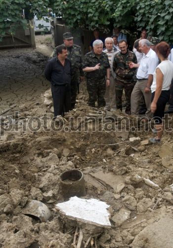 Міністр оборони України Юрій Єхануров, другий ліворуч, розмовляє з жителями одного з потерпілих від стихійного лиха (повінь) сіл в Чернівецькій обл., в суботу, 9 серпня 2008 р. Цього дня Міністр оборони приїхав з робочою поїздкою в Чернівецьку обл. За словами Єханурова, в регіонах надзвичайного положення на Західній Україні військовослужбовці Ззбройних сил залишатимуться стільки, скільки це необхідно буде для надання допомоги місцевому населенню та ліквідації наслідків стихії. На даний час, як повідомив міністр, в зоні екологічної катастрофи працюють 3 тисячі 200 військовослужбовців і 462 одиниці інженерної й автомобільної техніки. Фото Сергія Светлицького / УНІАН