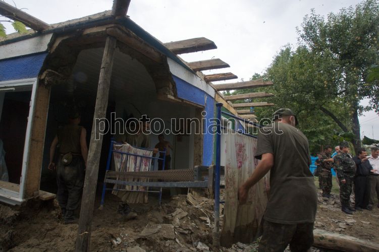 Військовослужбовці Міністерства оборони України прибирають у дворі одного з потерпілих від стихійного лиха (повінь) сіл в Чернівецькій обл., в суботу, 9 серпня 2008 р. Цього дня Міністр оборони України приїхав з робочою поїздкою в Чернівецьку обл. За словами міністра, в регіонах надзвичайного положення на Західній Україні військовослужбовці Озброєних сил України залишатимуться стільки, скільки це необхідно буде для надання допомоги місцевому населенню та ліквідації наслідків стихії. На даний час, як повідомив міністр, в зоні екологічної катастрофи працюють 3 тисячі 200 військовослужбовців і 462 одиниці інженерної й автомобільної техніки. Фото Сергія Светлицького / УНІАН