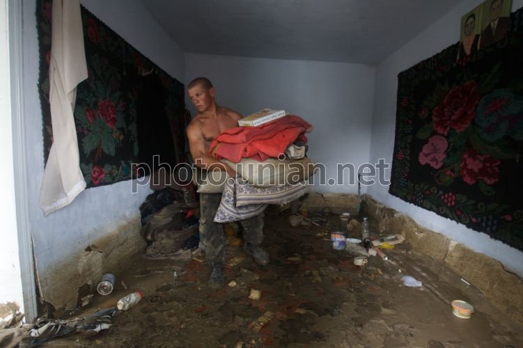 Військовослужбовець Міністерства оборони України допомогає з прибиранням у дворі одного з потерпілих від стихійного лиха (повінь) сіл в Чернівецькій обл., в суботу, 9 серпня 2008 р. Цього дня Міністр оборони України Юрій Єхануров приїхав з робочою поїздкою в Чернівецьку обл. За словами Єханурова, в регіонах надзвичайного положення на Західній Україні військовослужбовці Озброєних сил України залишатимуться стільки, скільки це необхідно буде для надання допомоги місцевому населенню та ліквідації наслідків стихії. На даний час, як повідомив міністр, в зоні екологічної катастрофи працюють 3 тисячі 200 військовослужбовців і 462 одиниці інженерної й автомобільної техніки. Фото Сергія Светлицького / УНІАН