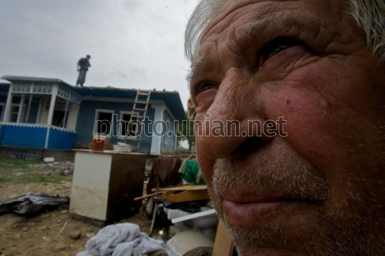 Місцевий мешканець одного з потерпілих від стихійного лиха (повінь) сіл у дворі біля напівзруйнованого дому в Чернівецькій обл., в суботу, 9 серпня 2008 р. Цього дня Міністр оборони України приїхав з робочою поїздкою до Чернівецької обл. За словами, міністра в регіонах надзвичайного положення на Західній Україні військовослужбовці Ззбройних сил залишатимуться стільки, скільки це необхідно буде для надання допомоги місцевому населенню та ліквідації наслідків стихії. На даний час, як повідомив міністр, в зоні екологічної катастрофи працюють 3 тисячі 200 військовослужбовців і 462 одиниці інженерної й автомобільної техніки. Фото Сергія Светлицького / УНІАН