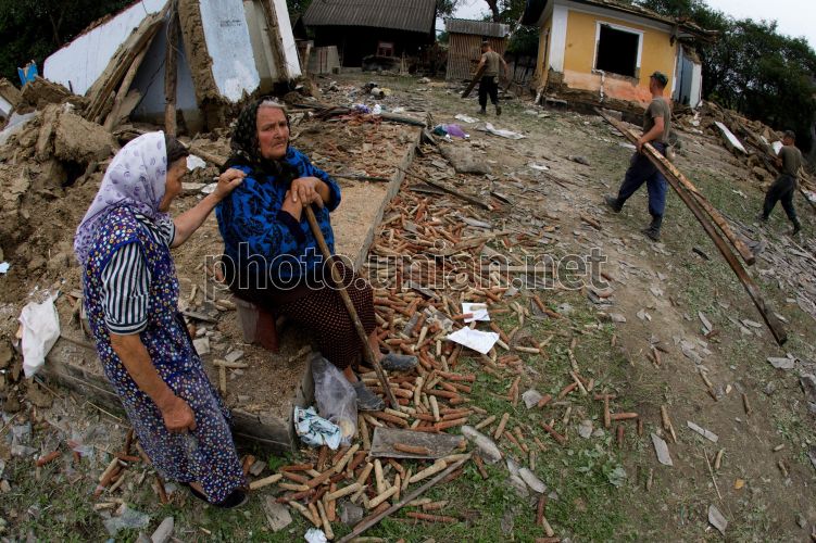 Місцеві мешканки одного з потерпілих від стихійного лиха (повінь) сіл у дворі біля напівзруйнованого дому вв Чернівецькій обл., в суботу, 9 серпня 2008 р. Цього дня Міністр оборони України Юрій Єхануров приїхав з робочою поїздкою в Чернівецьку обл. За словами Єханурова, в регіонах надзвичайного положення на Західній Україні військовослужбовці Озброєних сил України залишатимуться стільки, скільки це необхідно буде для надання допомоги місцевому населенню та ліквідації наслідків стихії. На даний час, як повідомив міністр, в зоні екологічної катастрофи працюють 3 тисячі 200 військовослужбовців і 462 одиниці інженерної й автомобільної техніки. Фото Сергія Светлицького / УНІАН