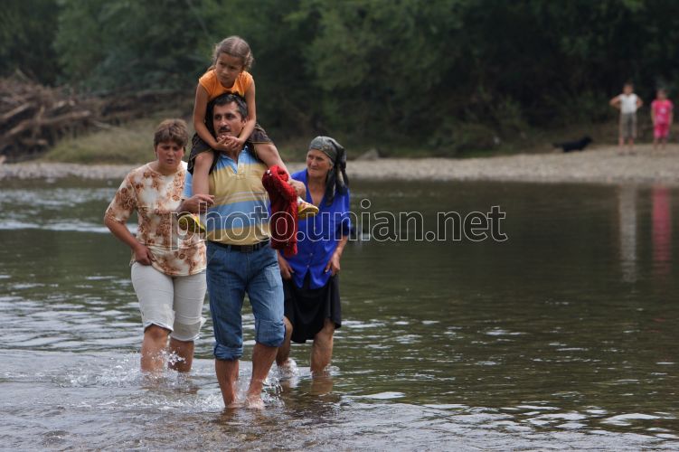 Місцеві мешканці одного з потерпілих від стихійного лиха (повінь) сіл переходять річку біля зруйнованого моста в Чернівецькій обл., в суботу, 9 серпня 2008 р. Цього дня Міністр оборони України приїхав з робочою поїздкою до Чернівецької обл. За словами, міністра в регіонах надзвичайного положення на Західній Україні військовослужбовці Ззбройних сил залишатимуться стільки, скільки це необхідно буде для надання допомоги місцевому населенню та ліквідації наслідків стихії. На даний час, як повідомив міністр, в зоні екологічної катастрофи працюють 3 тисячі 200 військовослужбовців і 462 одиниці інженерної й автомобільної техніки. Фото Сергія Светлицького / УНІАН