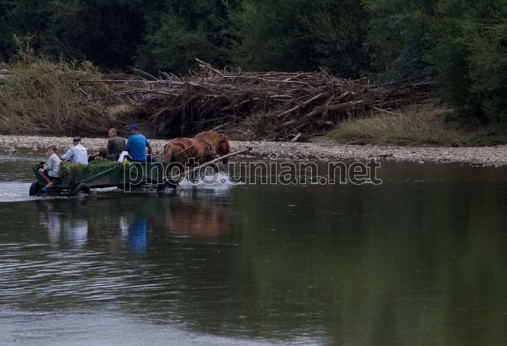 Місцеві мешканці одного з потерпілих від стихійного лиха (повінь) сіл їдуть на возі біля зруйнованого моста в Чернівецькій обл., в суботу, 9 серпня 2008 р. Цього дня Міністр оборони України приїхав з робочою поїздкою до Чернівецької обл. За словами, міністра в регіонах надзвичайного положення на Західній Україні військовослужбовці Ззбройних сил залишатимуться стільки, скільки це необхідно буде для надання допомоги місцевому населенню та ліквідації наслідків стихії. На даний час, як повідомив міністр, в зоні екологічної катастрофи працюють 3 тисячі 200 військовослужбовців і 462 одиниці інженерної й автомобільної техніки. Фото Сергія Светлицького / УНІАН