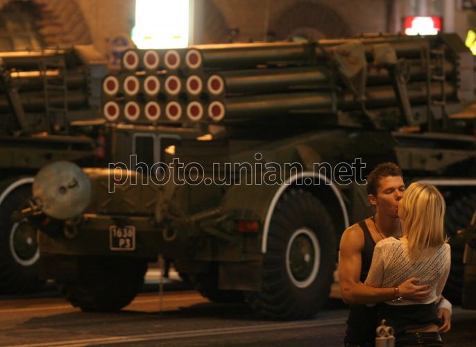 Молода пара цілується біля колони механізованої техніки, яка візьме участь у військовому параді на честь 17-ї річниці незалежності України, проходить центром Києва у вівторок, 19 серпня 2008 р. Фото УНІАН