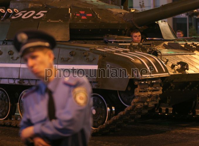 Міліціонер стоїть біля колони механізованої техніки, яка візьме участь у військовому параді на честь 17-ї річниці незалежності України, проходить центром Києва у вівторок, 19 серпня 2008 р. Фото УНІАН
