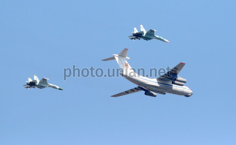 Ланка військових літаків пролітає над центром Києва під час репетиції військового параду на честь Дня Незалежності України, у п'ятницю, 22 серпня 2008 р. Фото УНІАН