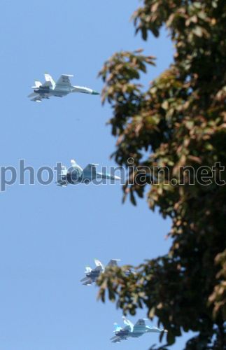 Ланка військових літаків пролітає над центром Києва під час репетиції військового параду на честь Дня Незалежності України, у п'ятницю, 22 серпня 2008 р. Фото УНІАН