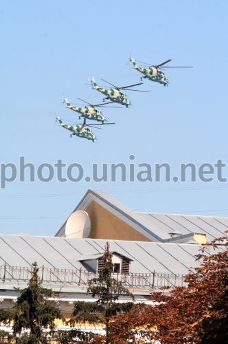 Ланка військових гелікоптерів пролітає над центром Києва під час репетиції військового параду на честь Дня Незалежності України, у п’ятницю, 22 серпня 2008 р. Фото УНІАН