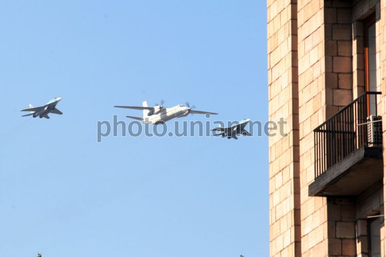 Ланка військових літаків пролітає над центром Києва під час репетиції військового параду на честь Дня Незалежності України, у п’ятницю, 22 серпня 2008 р. Фото УНІАН