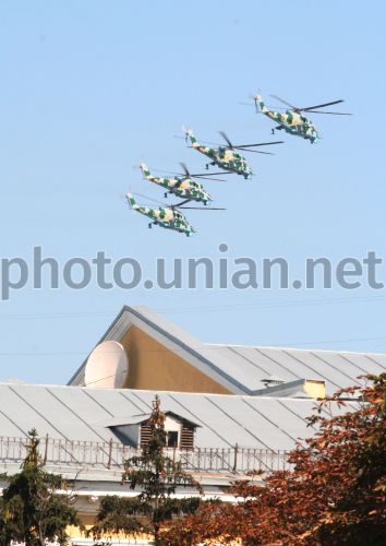 Ланка військових гелікоптерів пролітає над центром Києва під час репетиції військового параду на честь Дня Незалежності України, у п’ятницю, 22 серпня 2008 р. Фото УНІАН