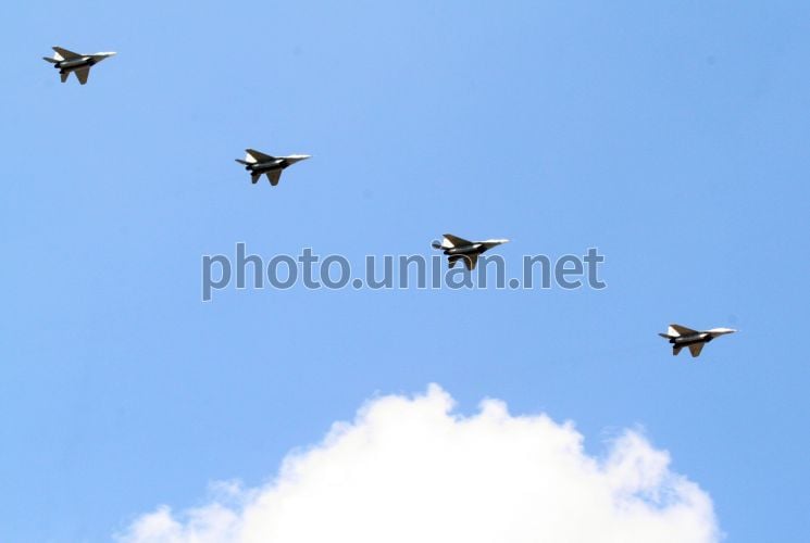 Ланка військових літаків пролітає над центром Києва під час репетиції військового параду на честь Дня Незалежності України, у п’ятницю, 22 серпня 2008 р. Фото УНІАН