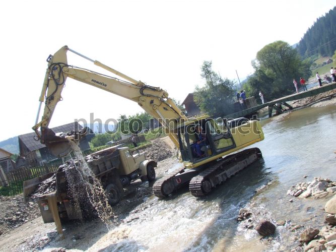 Екскаватор прочищає русло р.Сирет у с. Долішній Шепіт ( Вижницький р-н, Чернівецька обл.), в середу, 3 вересня 2008 р. Наразі, у 36 населених пунктах Чернівецької обл. проводяться інтенсивні роботи з відбудови доріг та мостів, знищених, або частково зруйнованих внаслідок повені 23-27 липня на Західній Україні. На відбудові доріг та мостів працюють підрядні організації з Дніпропетровської, Донецької, Київської, Черкаської, Чернігівської, Одеської та інших областей. На відновлювальних роботах задіяно понад 505 одиниць техніки, працюють понад 2 тисячі осіб. Загалом, від повені на Буковині постраждало 194 населених пункти. Загальний об’єм відновлювальних робіт на дорогах комунальної власності Буковини становить 1226 км доріг, з яких 60 км, - асфальтні, а 1166 км - гравійні. Сума коштів, виділена державою на ці роботи, становить 260 млн. гривень. Фото УНІАН