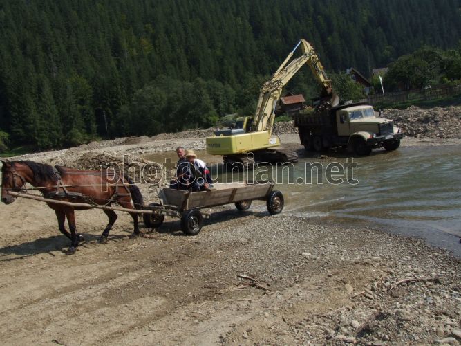 Місцеві мешканці долають убрід на підводі р.Сирет у с. Долішній Шепіт ( Вижницький р-н, Чернівецька обл.), в середу, 3 вересня 2008 р. Наразі, у 36 населених пунктах Чернівецької обл. проводяться інтенсивні роботи з відбудови доріг та мостів, знищених, або частково зруйнованих внаслідок повені 23-27 липня на Західній Україні. На відбудові доріг та мостів працюють підрядні організації з Дніпропетровської, Донецької, Київської, Черкаської, Чернігівської, Одеської та інших областей. На відновлювальних роботах задіяно понад 505 одиниць техніки, працюють понад 2 тисячі осіб. Загалом, від повені на Буковині постраждало 194 населених пункти. Загальний об’єм відновлювальних робіт на дорогах комунальної власності Буковини становить 1226 км доріг, з яких 60 км, - асфальтні, а 1166 км - гравійні. Сума коштів, виділена державою на ці роботи, становить 260 млн. гривень. Фото УНІАН