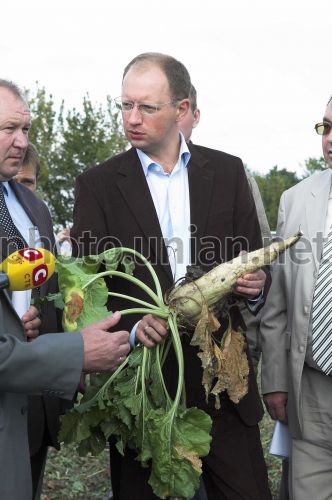 Голова Верховної Ради України Арсеній Яценюк тримає в руках цукровий буряк під час відвідання філії “Клембівка” ЗАТ продовольчої компанії “Поділля”, у с. Клембівка, Ямпільського р-ну, у середу, 10 вересня 2008 р. Цього дня Голова Верховної Ради України відвідав з робочою поїздкою Вінницьку область. У с. Клембівка Ямпільського району Яценюк оглянув поле цукрових буряків і ознайомився з проблемами цукрової галузі. Також у цьому селі він провів зустріч з керівниками органів місцевого самоврядування, виконавчої влади районів, що постраждали від повені. У Ямпільському районі голова ВР також ознайомиться з перебігом робіт з ліквідації наслідків повені у місті Ямпіль та зустрінеться з жителями потерпілого мікрорайону. Фото Анастасії Сироткіної / POOL / УНІАН
