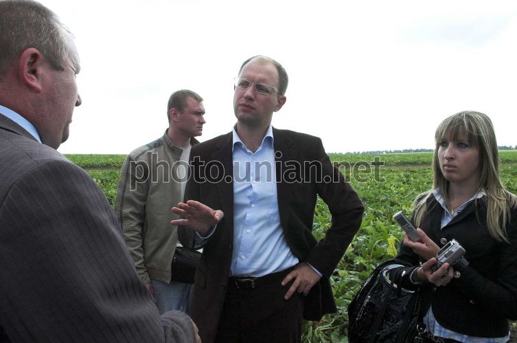 Голова Верховної Ради України Арсеній Яценюк, в центрі, під час відвідання філії “Клембівка” ЗАТ продовольчої компанії “Поділля”, у с. Клембівка, Ямпільського р-ну, у середу, 10 вересня 2008 р. Цього дня Голова Верховної Ради України відвідав з робочою поїздкою Вінницьку область. У с. Клембівка Ямпільського району Яценюк оглянув поле цукрових буряків і ознайомився з проблемами цукрової галузі. Також у цьому селі він провів зустріч з керівниками органів місцевого самоврядування, виконавчої влади районів, що постраждали від повені. У Ямпільському районі голова ВР також ознайомиться з перебігом робіт з ліквідації наслідків повені у місті Ямпіль та зустрінеться з жителями потерпілого мікрорайону. Фото Анастасії Сироткіної / POOL / УНІАН