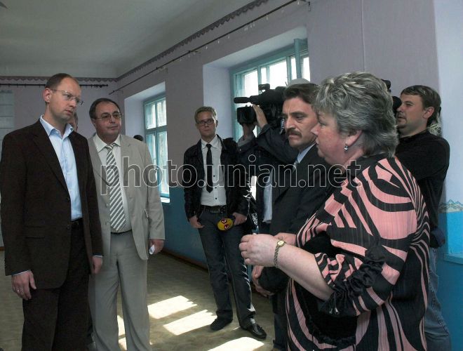Голова Верховної Ради України Арсеній Яценюк, ліворуч, розмовляє з вчителями в районній загальноосвітній школі І-ІІІ ст., у с. Пороги, Ямпільського р-ну, у середу, 10 вересня 2008 р. Цього дня Голова Верховної Ради України відвідав з робочою поїздкою Вінницьку область. У с. Клембівка Ямпільського району Яценюк оглянув поле цукрових буряків і ознайомився з проблемами цукрової галузі. Також у цьому селі він провів зустріч з керівниками органів місцевого самоврядування, виконавчої влади районів, що постраждали від повені. У Ямпільському районі голова ВР також ознайомився з перебігом робіт з ліквідації наслідків повені у місті Ямпіль та зустрівся з жителями потерпілого мікрорайону. На міжнародному пункту пропуску “Ямпіль-Косеуць” Яценюк ознайомився із станом відновлювальних робіт, у с.Пороги відвідав дитячу дошкільну установу “Калинонька”, що постраждала від повені. Фото Анастасії Сироткіної / POOL / УНІАН