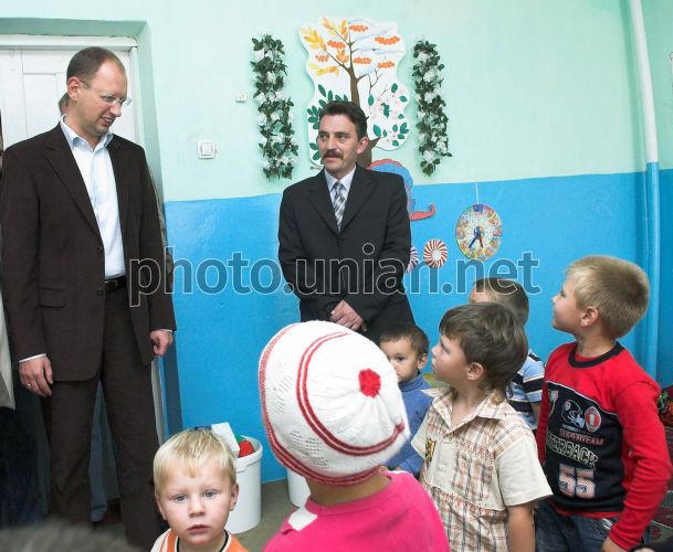 Голова Верховної Ради України Арсеній Яценюк, ліворуч, в дитячій дошкільній установі “Калинонька”, в с. Пороги, Ямпільського р-ну, у середу, 10 вересня 2008 р. Цього дня Голова Верховної Ради України відвідав з робочою поїздкою Вінницьку область. У с. Клембівка Ямпільського району Яценюк оглянув поле цукрових буряків і ознайомився з проблемами цукрової галузі. Також у цьому селі він провів зустріч з керівниками органів місцевого самоврядування, виконавчої влади районів, що постраждали від повені. У Ямпільському районі голова ВР також ознайомився з перебігом робіт з ліквідації наслідків повені у місті Ямпіль та зустрівся з жителями потерпілого мікрорайону. На міжнародному пункту пропуску “Ямпіль-Косеуць” Яценюк ознайомився із станом відновлювальних робіт, у с.Пороги відвідав дитячу дошкільну установу “Калинонька”, що постраждала від повені. Фото Анастасії Сироткіної / POOL / УНІАН