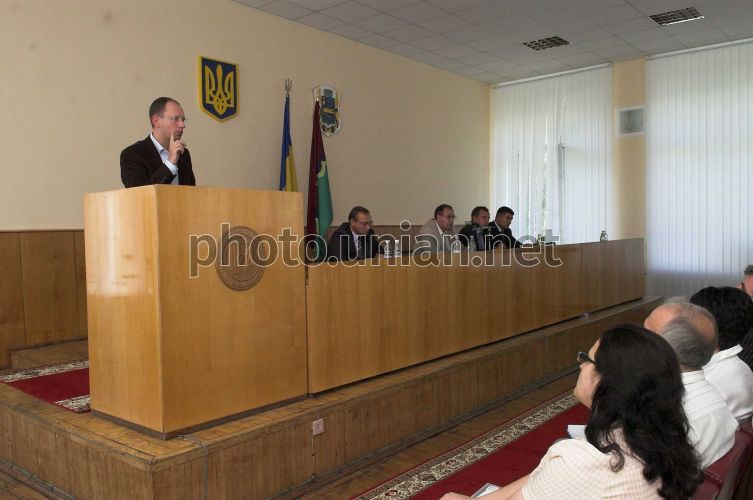 Голова Верховної Ради України Арсеній Яценюк, ліворуч, виступає з трибуни під час зустрічі з керівниками органів місцевого самоврядування, виконавчої влади постраждалих від повені районів Вінницької області, в с. Клембівка, Ямпільського р-на, у середу, 10 вересня 2008 р. На зустрічі голова Верховної Ради України заявив, що проект державного бюджету на 2009 рік до парламенту не надійшов. За його словами, згідно з законодавством України проект бюджету на наступний рік мав надійти до 15 вересня. Він зазначив: «думаю, що буде як завжди – за одну ніч уряд проголосує бюджет, за ту ж ніч вкинуть у ВР». Яценюк припустив, що за допомогою «політичних компромісів» буде прийнятий проект бюджету на наступний рік, як це бувало завжди. Цього дня Голова Верховної Ради України відвідав з робочою поїздкою Вінницьку область. Фото Анастасії Сироткіної / POOL / УНІАН