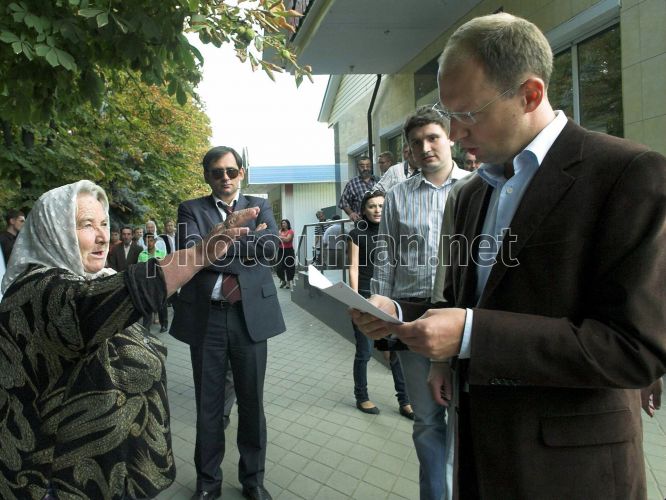 Голова Верховної Ради України Арсеній Яценюк, праворуч, розмовляє з місцевими жителями під час ознайомлення з територією, що постраждала від повені, в м. Ямпіль, у середу, 10 вересня 2008 р. Цього дня Голова Верховної Ради України відвідав з робочою поїздкою Вінницьку область. У с. Клембівка Ямпільського району Яценюк оглянув поле цукрових буряків і ознайомився з проблемами цукрової галузі. Також у цьому селі він провів зустріч з керівниками органів місцевого самоврядування, виконавчої влади районів, що постраждали від повені. У Ямпільському районі голова ВР також ознайомився з перебігом робіт з ліквідації наслідків повені у місті Ямпіль та зустрівся з жителями потерпілого мікрорайону. На міжнародному пункту пропуску “Ямпіль-Косеуць” Яценюк ознайомився із станом відновлювальних робіт, у с.Пороги відвідав дитячу дошкільну установу “Калинонька”, що постраждала від повені, а також зустрівся з педагогічним колективом та учнями районної загальноосвітньої школи І-ІІІ ст. Фото Анастасії Сироткіної / POOL / УНІАН