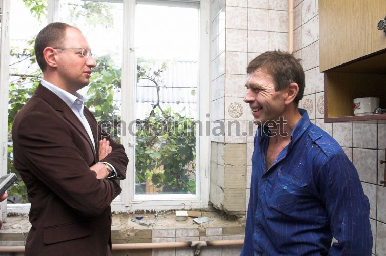 Господар будинку Василь Водзинський розповідає про відбудову оселі голові Верховної Ради України Арсенію Яценюку, ліворуч, в м. Ямпіль, у середу, 10 вересня 2008 р. Цього дня Голова Верховної Ради України відвідав з робочою поїздкою Вінницьку область. У с. Клембівка Ямпільського району Яценюк оглянув поле цукрових буряків і ознайомився з проблемами цукрової галузі. Також у цьому селі він провів зустріч з керівниками органів місцевого самоврядування, виконавчої влади районів, що постраждали від повені. У Ямпільському районі голова ВР також ознайомився з перебігом робіт з ліквідації наслідків повені у місті Ямпіль та зустрівся з жителями потерпілого мікрорайону. На міжнародному пункту пропуску “Ямпіль-Косеуць” Яценюк ознайомився із станом відновлювальних робіт, у с.Пороги відвідав дитячу дошкільну установу “Калинонька”, що постраждала від повені, а також зустрівся з педагогічним колективом та учнями районної загальноосвітньої школи І-ІІІ ст. Фото Анастасії Сироткіної / POOL / УНІАН