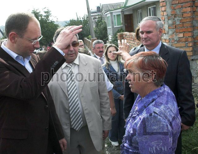 Голова Верховної Ради України Арсеній Яценюк, ліворуч, розмовляє з місцевими жителями під час ознайомлення з територією, що постраждала від повені, в м. Ямпіль, у середу, 10 вересня 2008 р. Цього дня Голова Верховної Ради України відвідав з робочою поїздкою Вінницьку область. У с. Клембівка Ямпільського району Яценюк оглянув поле цукрових буряків і ознайомився з проблемами цукрової галузі. Також у цьому селі він провів зустріч з керівниками органів місцевого самоврядування, виконавчої влади районів, що постраждали від повені. У Ямпільському районі голова ВР також ознайомився з перебігом робіт з ліквідації наслідків повені у місті Ямпіль та зустрівся з жителями потерпілого мікрорайону. На міжнародному пункту пропуску “Ямпіль-Косеуць” Яценюк ознайомився із станом відновлювальних робіт, у с.Пороги відвідав дитячу дошкільну установу “Калинонька”, що постраждала від повені, а також зустрівся з педагогічним колективом та учнями районної загальноосвітньої школи І-ІІІ ст. Фото Анастасії Сироткіної / POOL / УНІАН