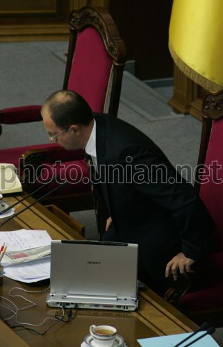 Голова Верховної Ради України Арсеній Яценюк залишає президію після оголошення про свою відставку на засіданні Верховної Ради України в Києві, в середу, 17 вересня 2008 р. Яценюк подав у відставку з посади голови Верховної Ради України. За словами Яценюка, вчора було оголошено про припинення діяльності коаліції демократичних сил, процедура юридично була завершена, але «політично вона не завершена». Він заявив: «Я приходив виключно під демократичними цінностями і під демократичними ідеалами. У владу треба заходити гідно і виходити з неї також гідно». Яценюк зауважив, що саме тому оголошує про свою відставку з посади голови ВР. «Що стосується роботи парламенту, то заяву я направляю в Регламентний комітет, і, відповідно до вимог тимчасового регламенту, до того моменту, поки не буде розглянуто це питання, я буду далі продовжувати керувати парламентом», - сказав Яценюк. Він закликав усіх депутатів «бути чесними перед собою і перед людьми, які нас вибрали». Фото Сергія Светлицького / УНІАН