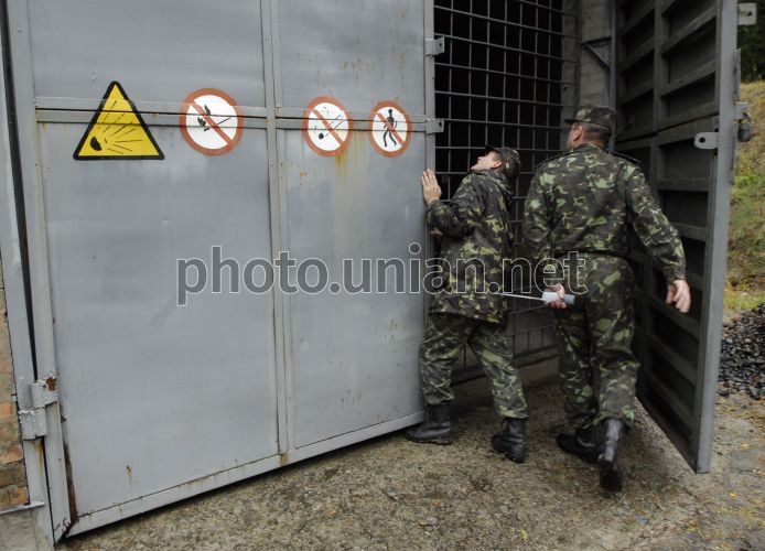 Військовослужбовці заходять на один зі складів на Центральій артилерійській базі зберігання боєприпасів Сухопутних військ Збройних Сил України, в с. Росішка, у середу, 17 вересня 2008 р. Цього дня на території артилерійської бази для представників засобів масової інформації було продемонстровано умови зберігання реактивних снарядів, заходи безпеки та попередження виникнення надзвичайних ситуацій. За останні кілька років збільшилася кількість вибухів на військових складах України. Фото Сергія Алексєєнка / УНІАН