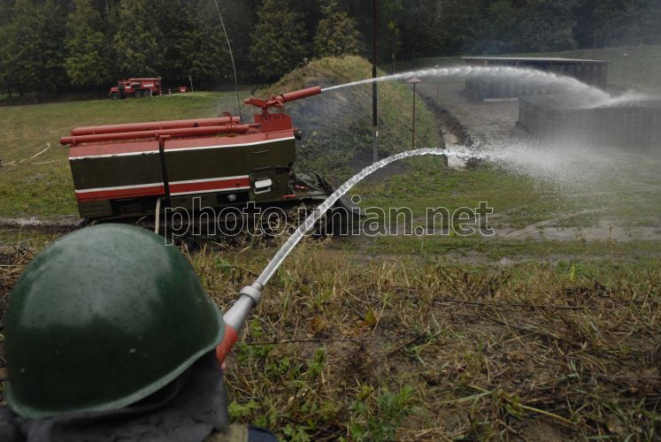 Військовий пожежник в ході навчання по гасінню пожеж на складі боєприпасів на Центральноій артилерійській базі зберігання боєприпасів Сухопутних військ Збройних Сил України, в с. Росішка, у середу, 17 вересня 2008 р. Цього дня на території артилерійської бази для представників засобів масової інформації було продемонстровано умови зберігання реактивних снарядів, заходи безпеки та попередження виникнення надзвичайних ситуацій. За останні кілька років збільшилася кількість вибухів на військових складах України. Фото Сергія Алексєєнка / УНІАН